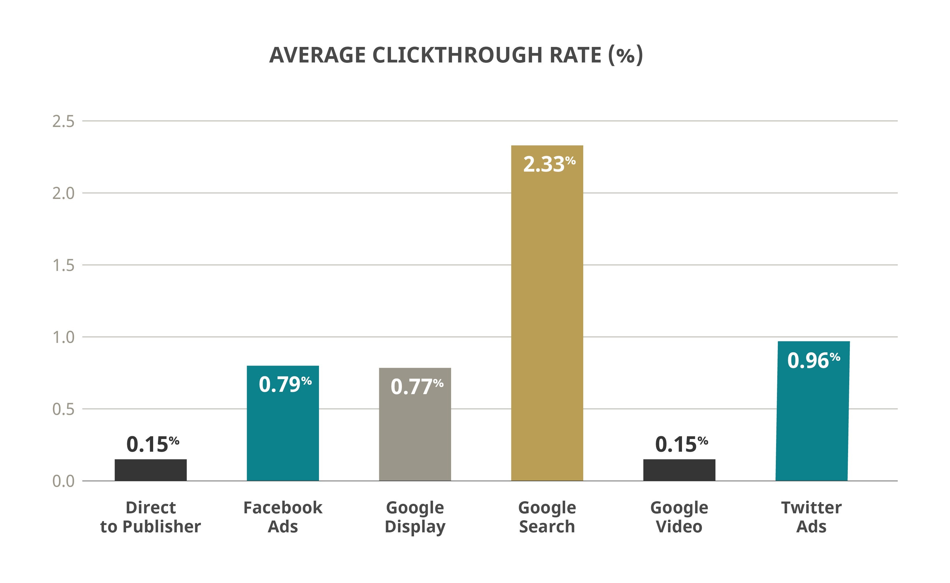 These search rates are lower than those of other industries, while the display rates are significantly higher (other industries see a CTR of approximately 3.17% for search and 0.46% for display as per benchmark rates reported by WordStream; social advertising was not included in their report).