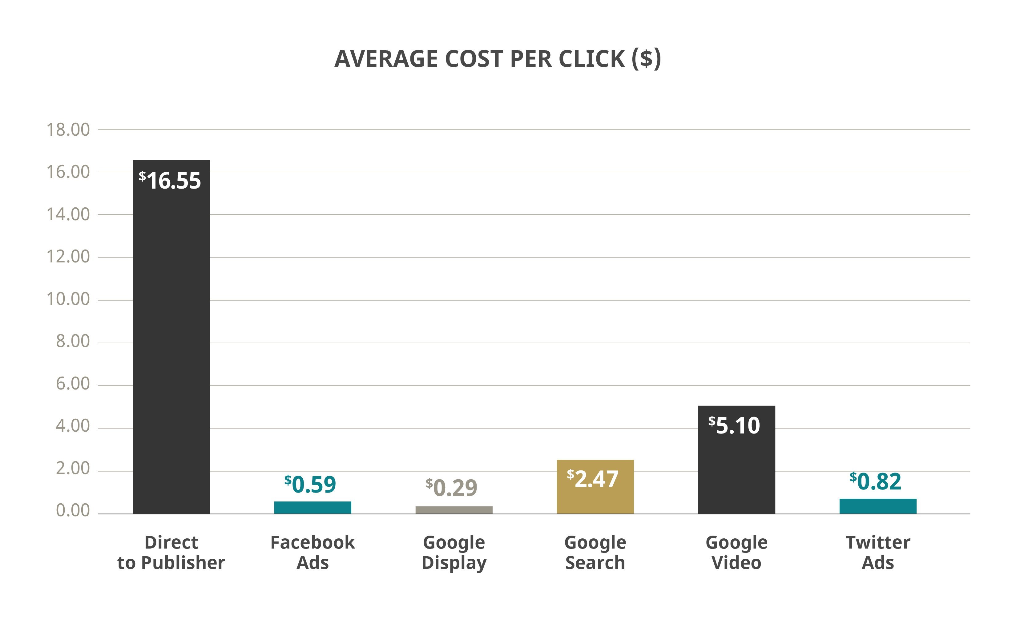 In the chart above, you’ll notice the average CPC for direct-to-publisher campaigns is over three times higher than for other platforms. With direct-to-publisher advertising, an advertiser purchases a block of potentially qualified impressions, however, there is no way of focusing on users who are more likely to click on our ads and visit a website. When contrasted with programmatic advertising options, which allow us to use platforms that can optimize advertising performance based on the desired outcomes, direct-to-publisher offers a less efficient use of marketing dollars, especially when our objective is to drive traffic to a website.