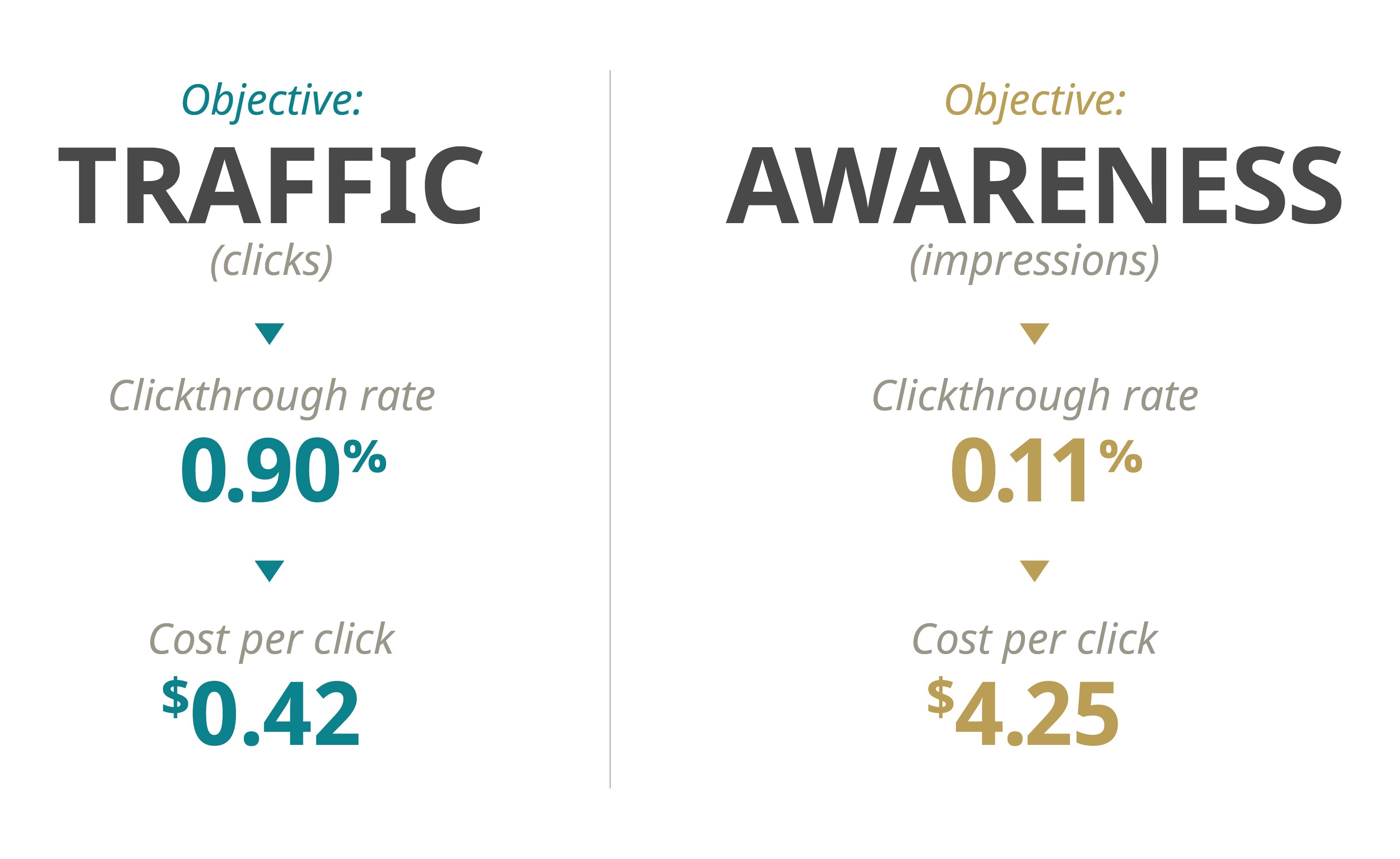 Traffic-based objectives deliver a higher-than-average clickthrough rate. This ought to be the case, as we rely on the algorithms provided by objective-based programmatic advertising. This chart demonstrates the ability of these algorithms to deliver the desired outcomes.