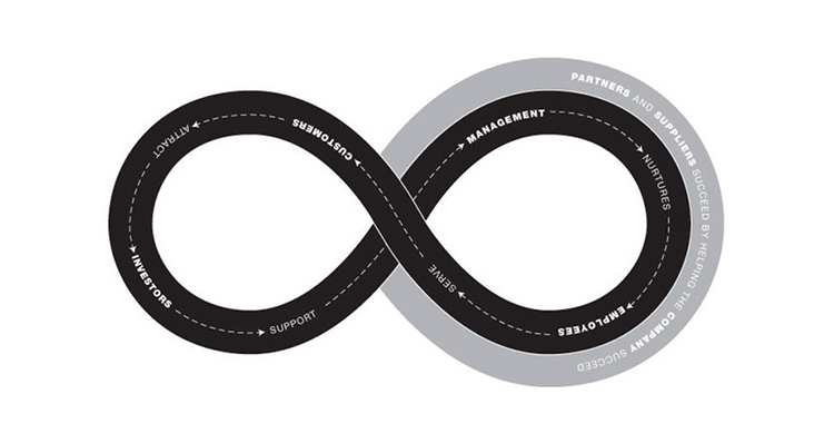 This chart from my book ZAG prescribes an orderly chain of relationships in which management nurtures employees, employees serve customers, customers attract investors, investors support management, management nurtures employees, and so on around the loop, creating a virtuous cycle of profitability.