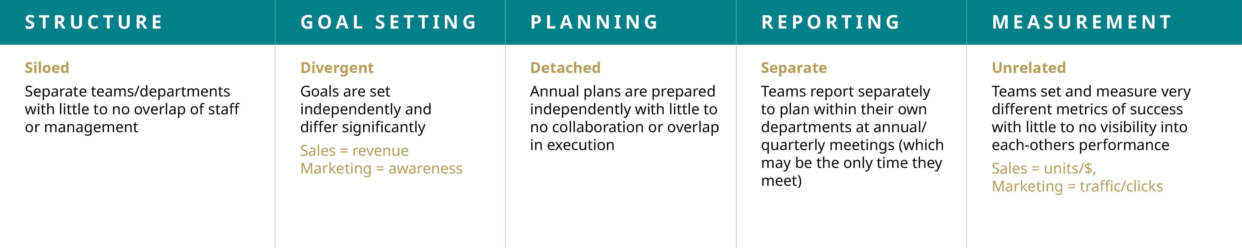 Also indicative of this stage of evolution is the setting and pursuit of very different team goals, where marketing is generally focused on generating demand (as measured by awareness and engagement) and sales is focused on generating leads and sales (as measured by market share and revenue).