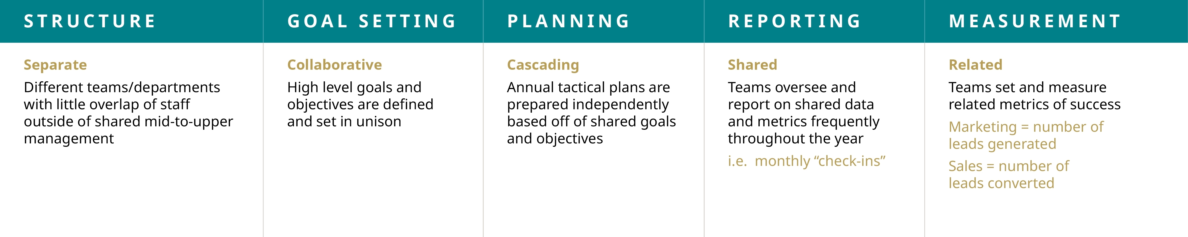 This stage of alignment is best characterized by the sharing of overarching goals and objectives with a strong degree of separation in execution. Sales and marketing are still very distinct teams, but they work together collectively and collaboratively during the planning process, defining shared goals, objectives, and measures of success, before working independently on tactical development and execution.