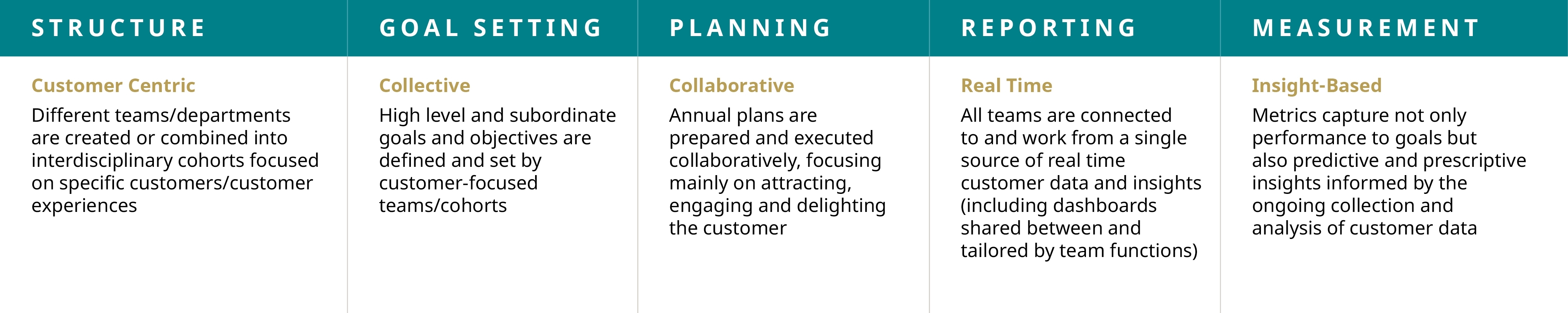 In this final stage of evolution, teams are aligned around an ongoing customer journey or overall customer experience (versus a linear sales funnel or path to purchase). Teams understand where and how their efforts continually move new customers into and through the many facets of the business. The dividing lines between different teams/departments become blurred as they may commonly work together in interdisciplinary cohorts focused on specific customers (i.e. business structure becomes driven by the customer, not the operation). Additionally, all teams involved typically work with an integrated set of customer data collection, analysis and engagement tools that provide a single, consistent “source of truth”, which is referred to in real-time through shared dashboards and reporting.